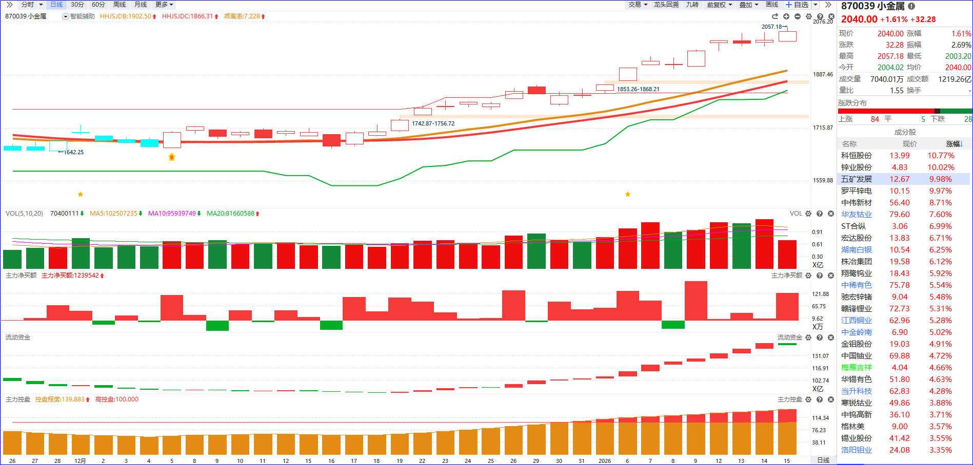 从软件信号看,有色金属板块近期表现强势,流动资金持续翻红,主力净买额呈现红肥绿瘦,K线走势震荡上行。当前板块整体处于高控盘状态且控盘力度稳步递增,内部涌现主力高控盘、筹码锁仓充分且股价突破创新高的标的。对于此类高控盘个股,只要未出现放量大阴线的破位形态,就尚未释放明确的风险信号,可继续跟踪关注。