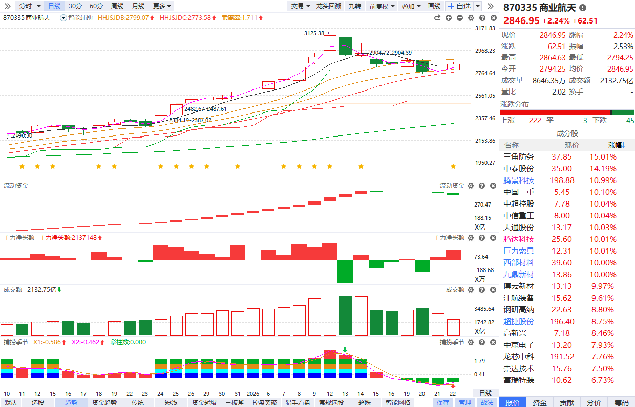 早盘商业航天概念持续回暖,巨力索具2连板,中超控股一字涨停,九鼎新材、电科芯片、万通发展等跟涨。