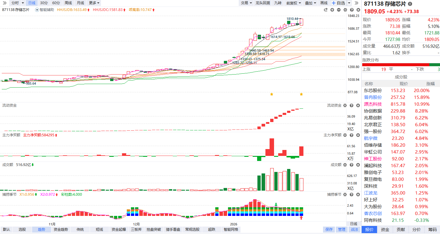 存储芯片概念表现活跃,普冉股份涨超12%再创新高,恒烁股份涨超10%,北京君正、兆易创新、神工股份跟涨。