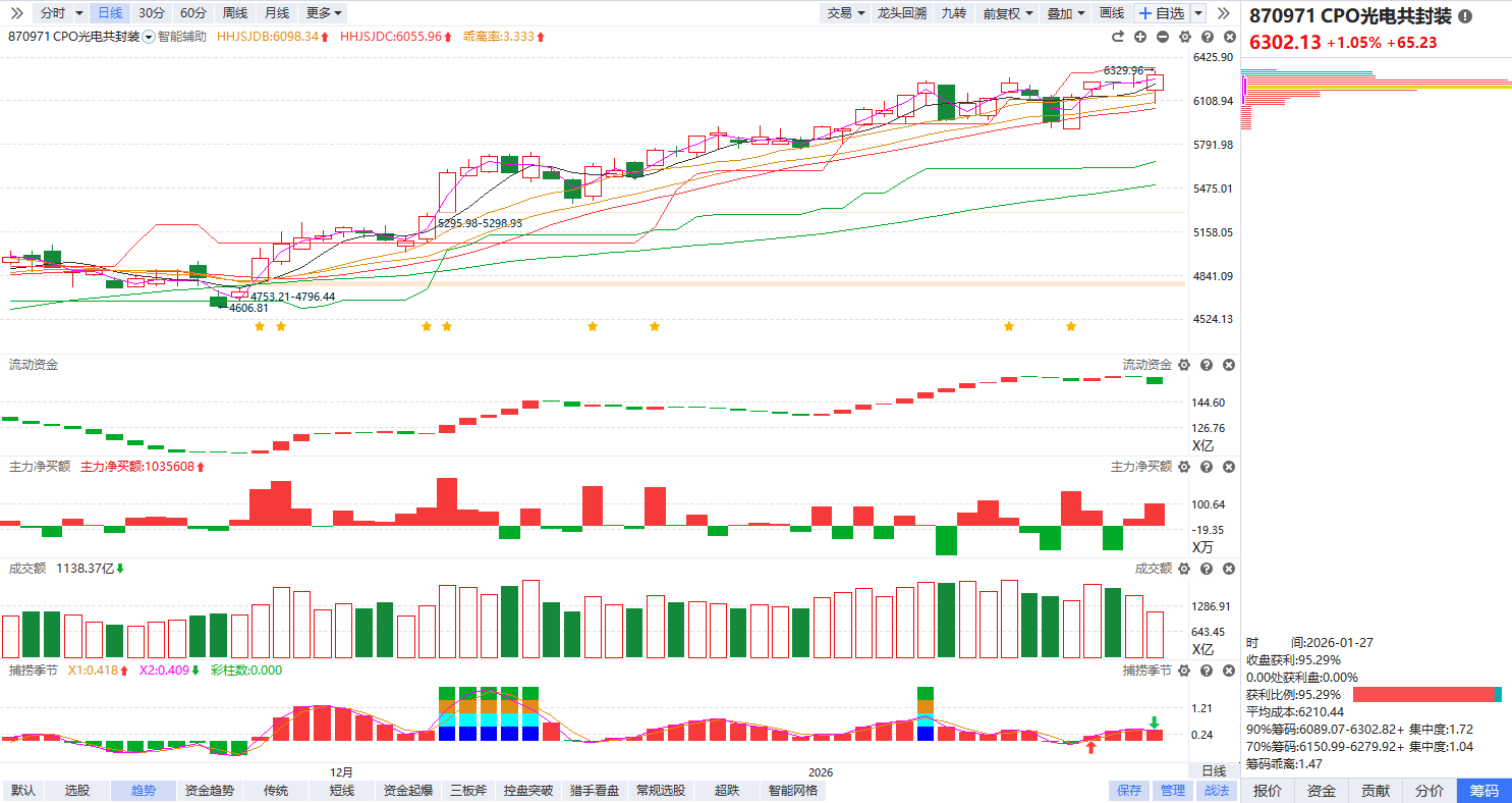 根据软件信号,板块近期流动资金持续翻红,主力净买额红肥绿瘦,资金强势背景下放量突破横盘平台,有望形成新一轮上升趋势。捕捞季节日线金叉初期的60分钟回档,可以留意资金和控盘走强个股的回档博弈。