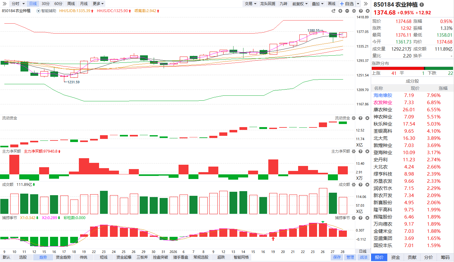 根据软件信号,板块近期流动资金持续翻红,主力净买额红肥绿瘦,资金强势背景下放量突破横盘平台。目前捕捞季节死叉次日快速金叉反包,短线趋势再度加速,急涨高潮后容易出现内部分化,注意回避冲高追涨,耐心等待缩量回踩5日线的分歧博弈节点。