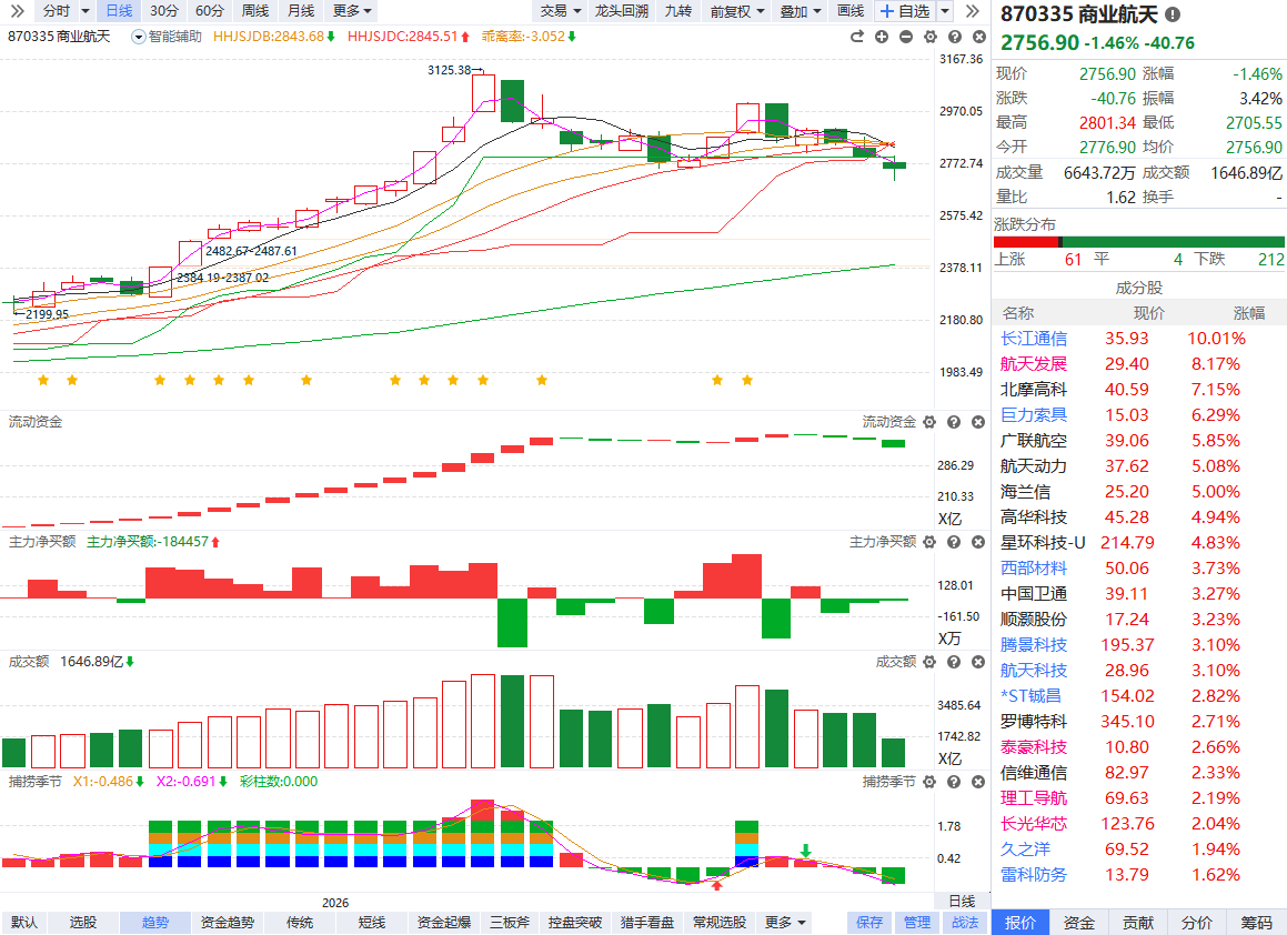 商业航天概念局部回暖,长江通信涨停,北摩高科触及涨停,欧科亿、航天发展、海兰信、广联航空、巨力索具跟涨。