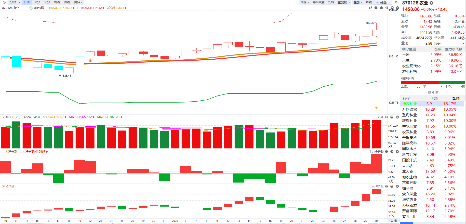 从软件信号看,农业概念近期流动资金持续翻红,主力净买额呈现红肥绿瘦,K线走势震荡上行,今日迎来阶段性爆发。需重点关注的是,农业概念的股性核心特征为避险属性,板块行情持续性较弱,操作上更偏向短线博弈,建议采取快进快出的策略。
