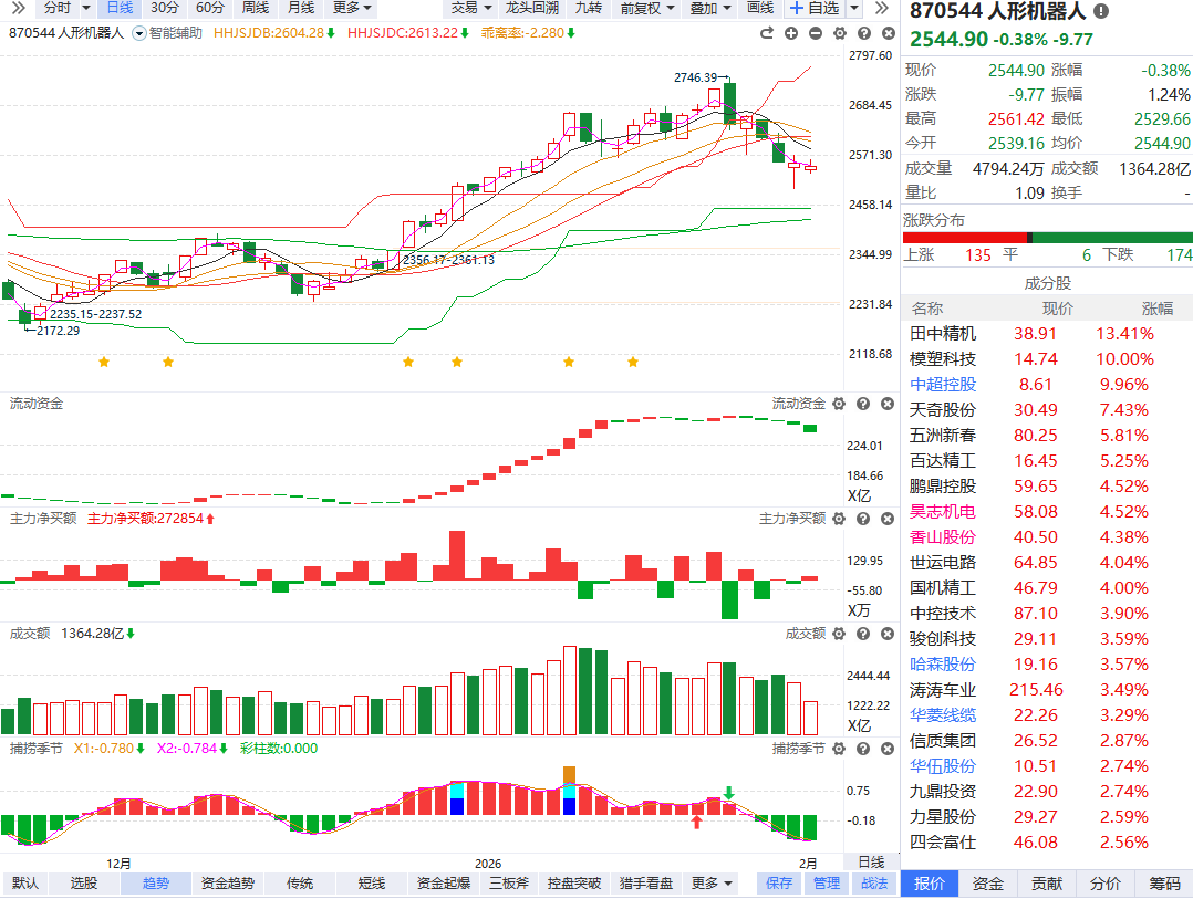 根据软件信号,板块近期流动资金持续翻红,不过趋势上已经跌破辅助线,短期如果不能快速收复,反抽容易再次承压,注意回避冲高追涨,耐心等待资金和趋势重新走强的节点。