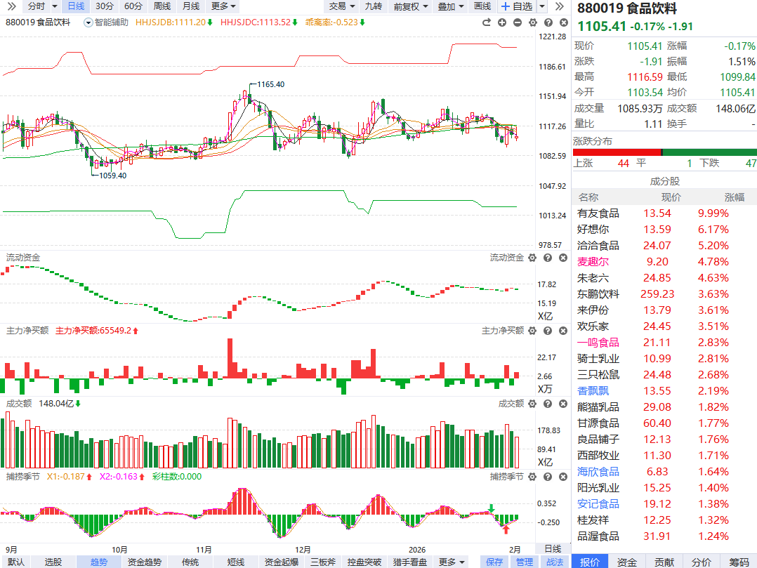 午后食品股局部异动,有友食品涨停,好想你、洽洽食品、朱老六、一鸣食品、一致魔芋跟涨。