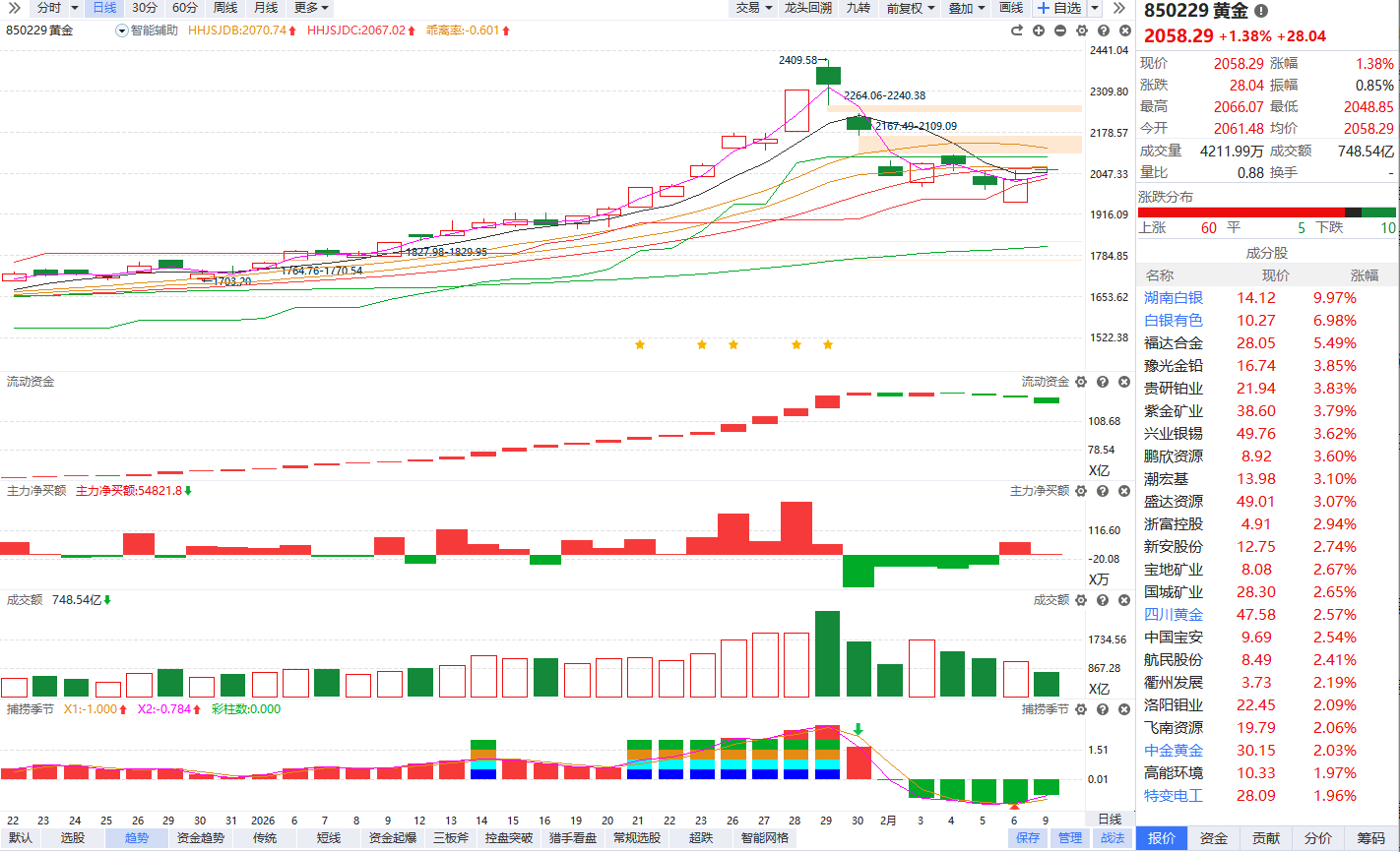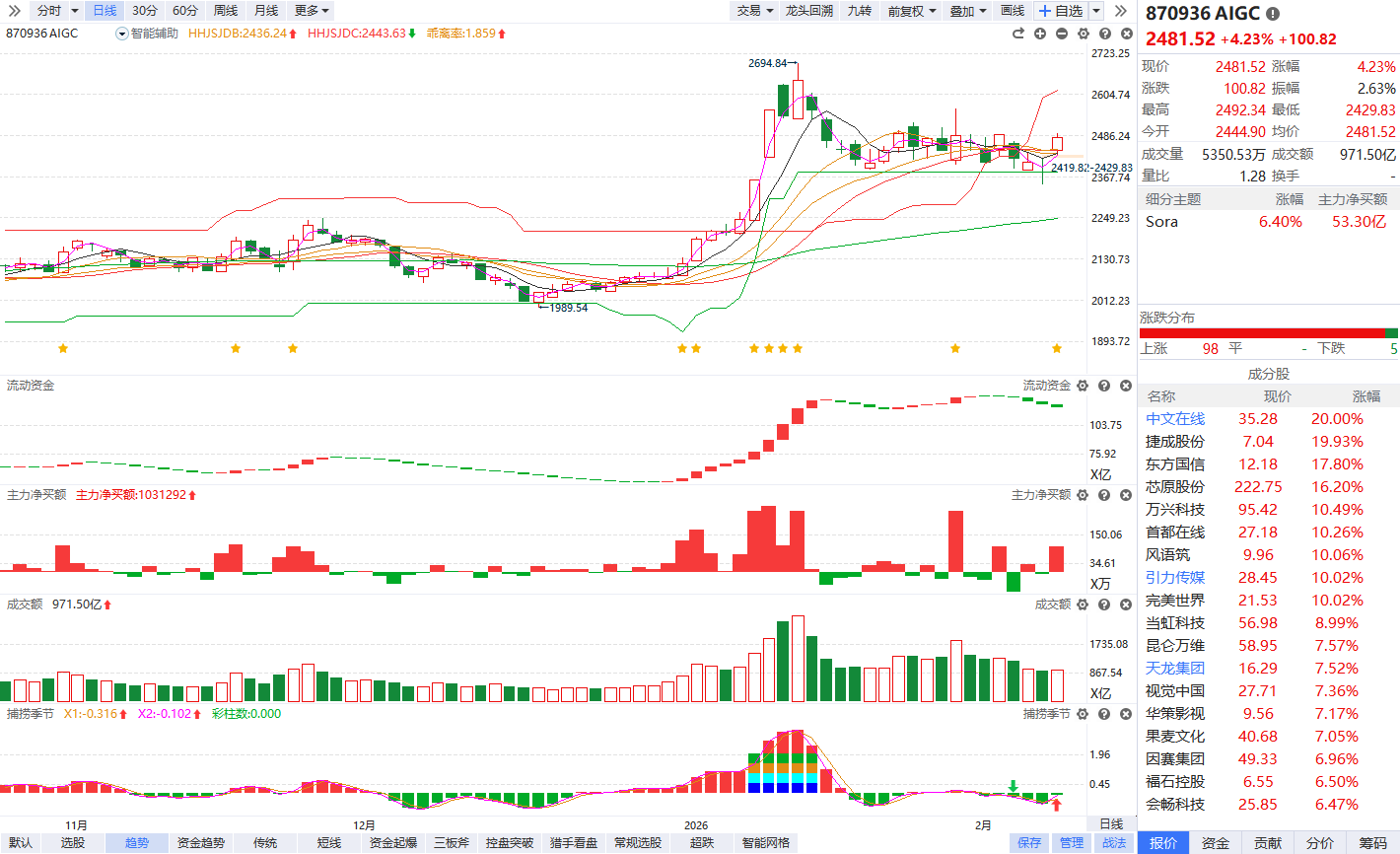 根据软件信号,板块近期流动资金持续翻绿,捕捞季节回档金叉,资金弱势背景下的回档反弹,容易再次出现内部分化,注意回避冲高追涨,耐心等待流动资金翻红的回档博弈节点。