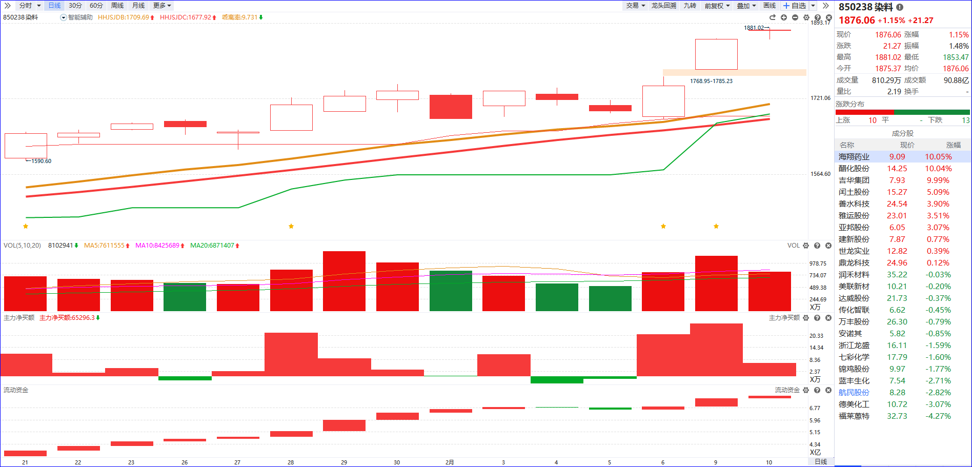 从软件信号看,化工板块近期流动资金持续翻红,主力净买额红肥绿瘦,K线整体表现为震荡上行。操作上,建议聚焦板块内部5日主力资金排序靠前、且主力控盘递增的标的,优先选择具备涨价逻辑支撑的化工个股布局。