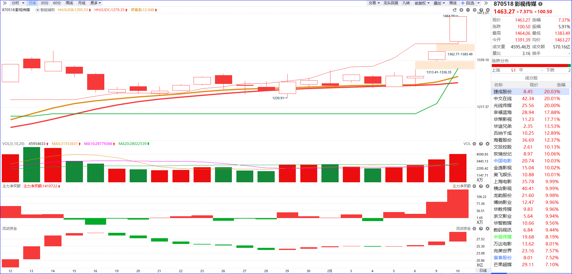 从软件信号看,影视传媒近期流动资金持续翻红,主力净买额翻红红肥绿瘦且红柱递增增长,K线迎来加速拉升。作为当下最热门的主题,短期可聚焦5日主力排序居前、流动资金保持持续翻红的前排个股。