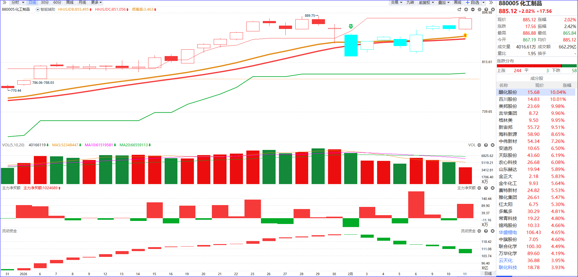 从软件信号看,化工板块近期流动资金持续翻绿,主力净买额红肥绿瘦,K线在智能辅助线附近震荡,板块内部有所分歧,在此背景下,布局需聚焦板块内5日主力资金排序靠前、流动资金率先翻红的个股,优先筛选受益于产品涨价逻辑、且主力控盘持续递增的标的。