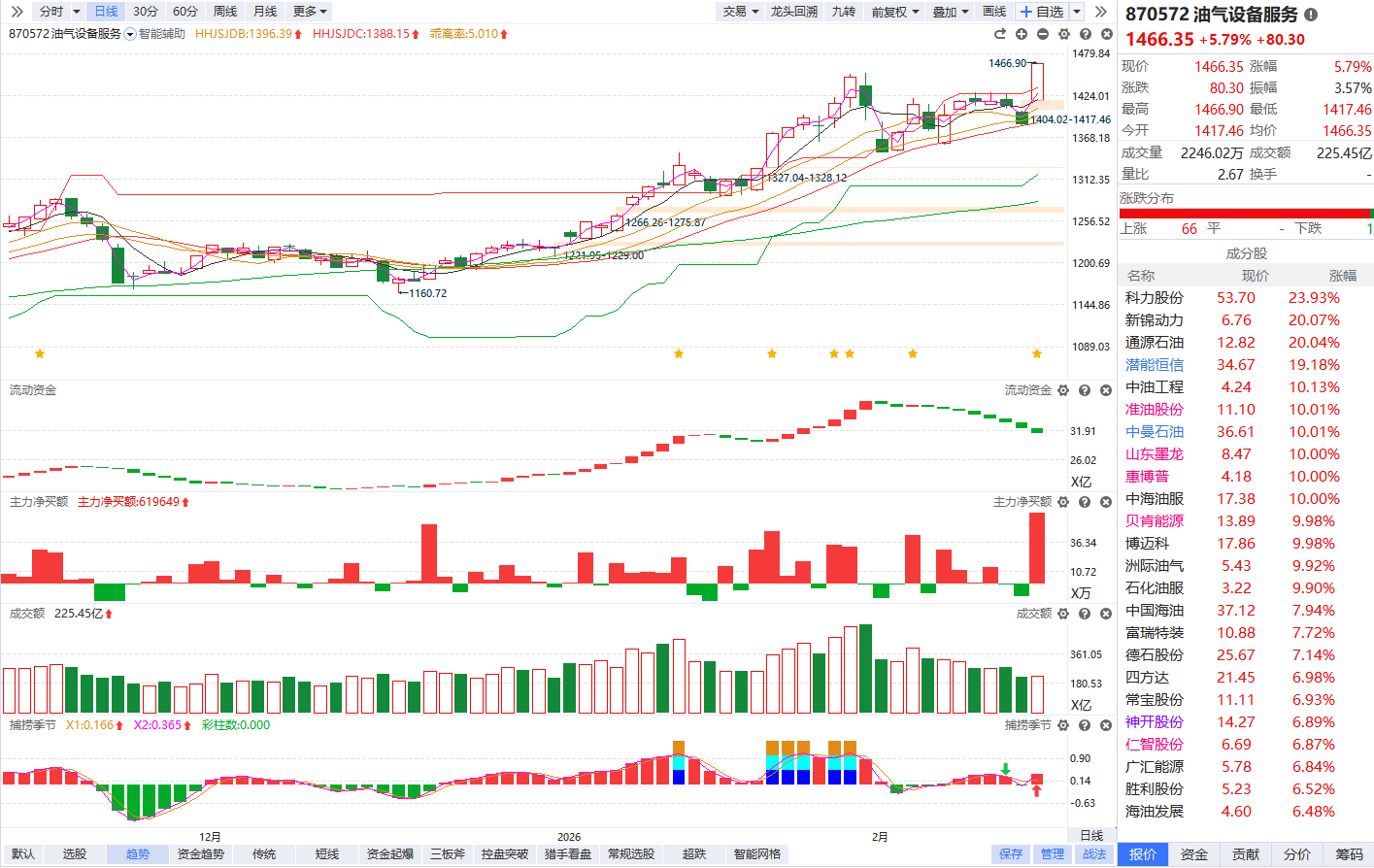 根据软件信号,板块近期流动资金持续翻红,主力净买额红肥绿瘦,回档金叉站后放量突破平台, 形成强势上涨趋势,如果资金持续翻红走强,捕捞季节日线金叉初期的60分钟回档具备短线性价比。