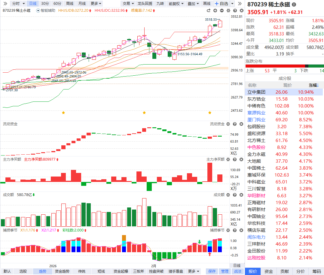 稀土永磁概念走强,包钢股份触及涨停,中稀有色、大地熊、盛和资源、北方稀土、银河磁体、天河磁体跟涨。
