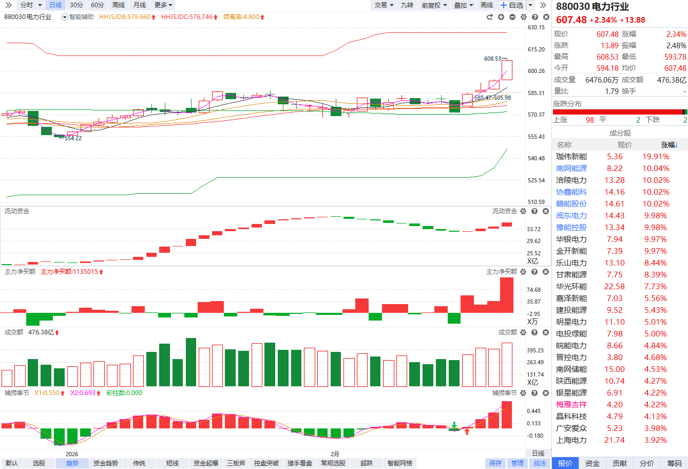午后电力板块持续走高,绿电方向领涨,南网能源封涨停,此前赣能股份、华银电力、涪陵电力、金开新能涨停,甘肃能源、乐山电力、明星电力、晋控电力、韶能股份等跟涨。