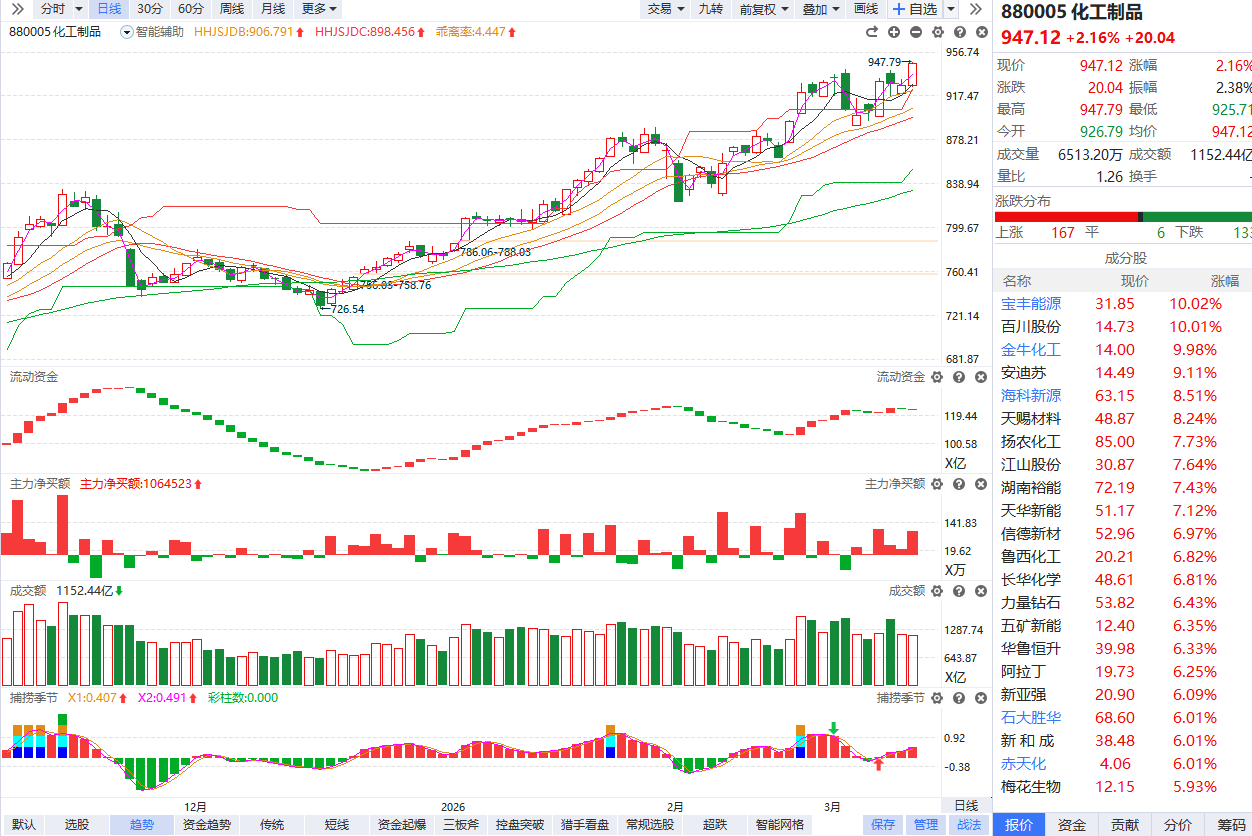 午后化工板块午后再度拉升,煤化工、盐化工方向领涨,金牛化工、中盐化工涨停,此前金浦钛业、百川股份、联科科技等涨停,宝丰能源、安迪苏、中泰化学、卫星化学、恒逸石化涨幅靠前。