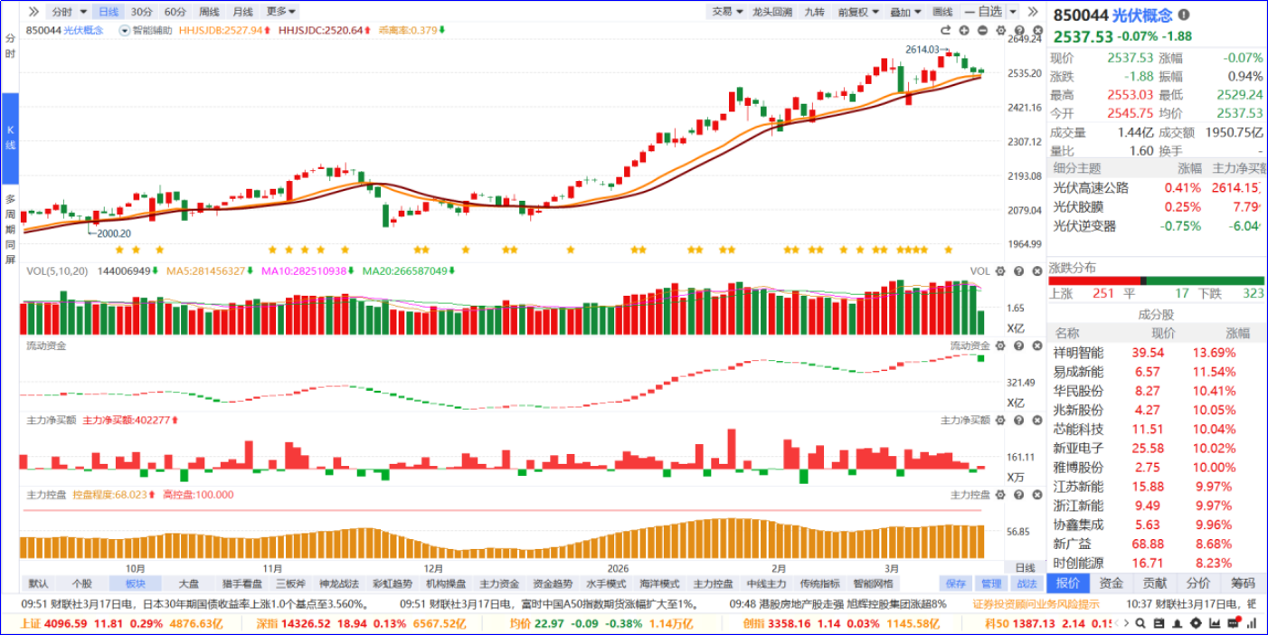 从软件信号看,光伏板块近期流动资金红绿相间,主力净买额红肥绿瘦。从炒作逻辑看,板块行情受益于光伏装机需求复苏、海外出口超预期及N型电池技术迭代的产业红利;从K线走势看,板块整体处于震荡向上的上升通道,今日高位小幅回调但仍依托智能辅助线波动,量能维持活跃;板块内部个股涨跌分化,涨停家数居市场第一位。后续可聚焦5日主力资金排序靠前、流动资金持续翻红的个股进行跟踪。