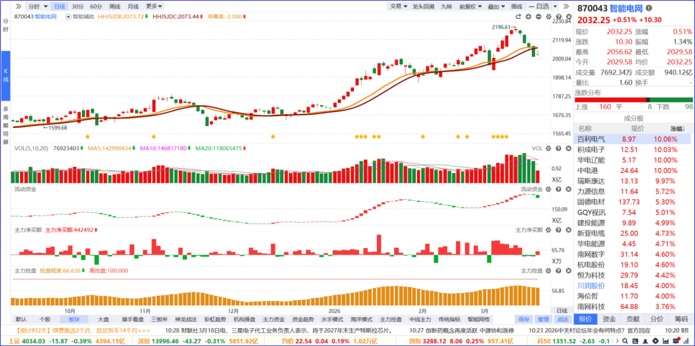 从软件信号看,智能电网板块近期流动资金翻绿,主力净买额红肥绿瘦。从炒作逻辑看,板块行情受益于新型电力系统建设、特高压升级与能源数字化转型的政策催化;从K线走势看,板块整体处于震荡向上趋势,量能维持活跃;内部个股涨跌分化,涨停家数居市场第一位,情绪热度未减。后续可聚焦 5 日主力资金排序靠前、流动资金持续翻红的个股进行跟踪。