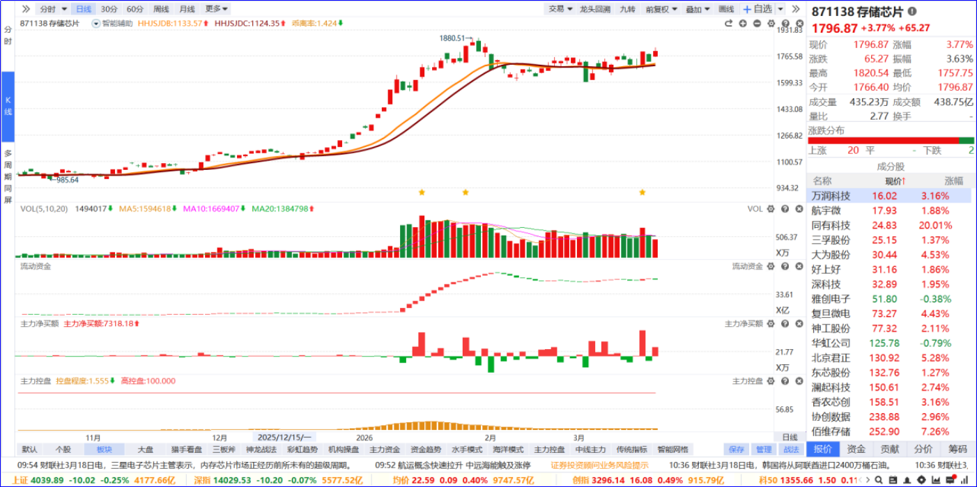 从软件信号看,存储芯片近期流动资金由绿转红,主力净买额红肥绿瘦。从炒作逻辑看,板块行情受益于存储超级周期开启、AI带动存储需求增长及国产替代深化的产业红利;从K线走势看,板块整体由前期上升转为围绕智能辅助线横盘震荡,内部个股普涨,情绪热度较高。后续可聚焦 5 日主力资金排序靠前、流动资金持续翻红,且主力控盘度递增的个股进行跟踪。