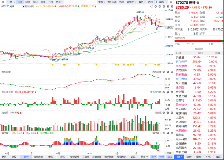 光纤概念涨势扩大,长飞光纤2连板,此前通鼎互联2连板,特发信息封涨停,长盈通、亨通光电、永鼎股份、中天科技涨幅靠前。