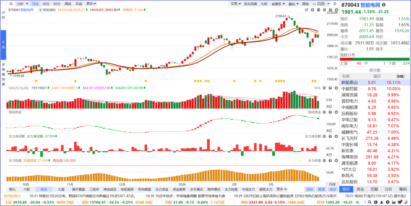 从软件信号看,智能电网概念近期流动资金由绿转红,主力净买额红肥绿瘦。从炒作逻辑看,板块依托新型电力系统建设与绿电高效消纳需求,政策与产业双轮驱动,绿电直连、智能配网等细分方向具备中长期成长空间。从K线走势看,板块前期处于上升趋势,高位回调跌破智能辅助线;内部个股涨跌分化明显,涨停家数居市场第一位。后续需注意内部细分行业炒作方向,优选5日主力资金排序靠前、流动资金持续翻红的核心标的。