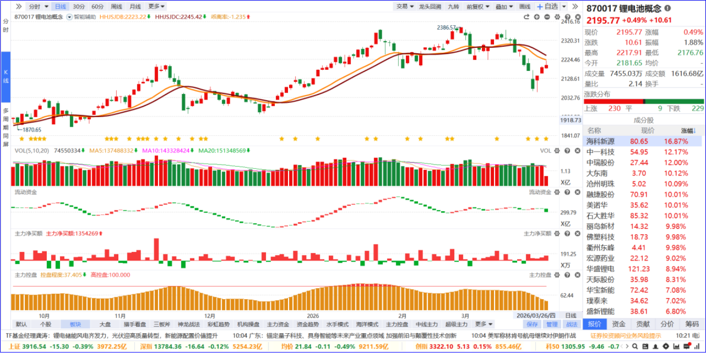 从软件信号看,锂电池板块近期流动资金翻绿,主力净买额红肥绿瘦。从炒作逻辑看,锂电池行业景气度持续回升,带动正极、负极隔膜等全产业链同步放量,机构预计4月排产环比继续显著提升,下游需求回暖带动产业链盈利修复预期增强。从K线走势看,板块高位回调后逐步修复,今日温和上涨,板块内个股涨跌分化明显,涨停家数居市场第一位。后续可以聚焦板块内部5日主力排序靠前,优选有业绩支撑的个股跟踪。