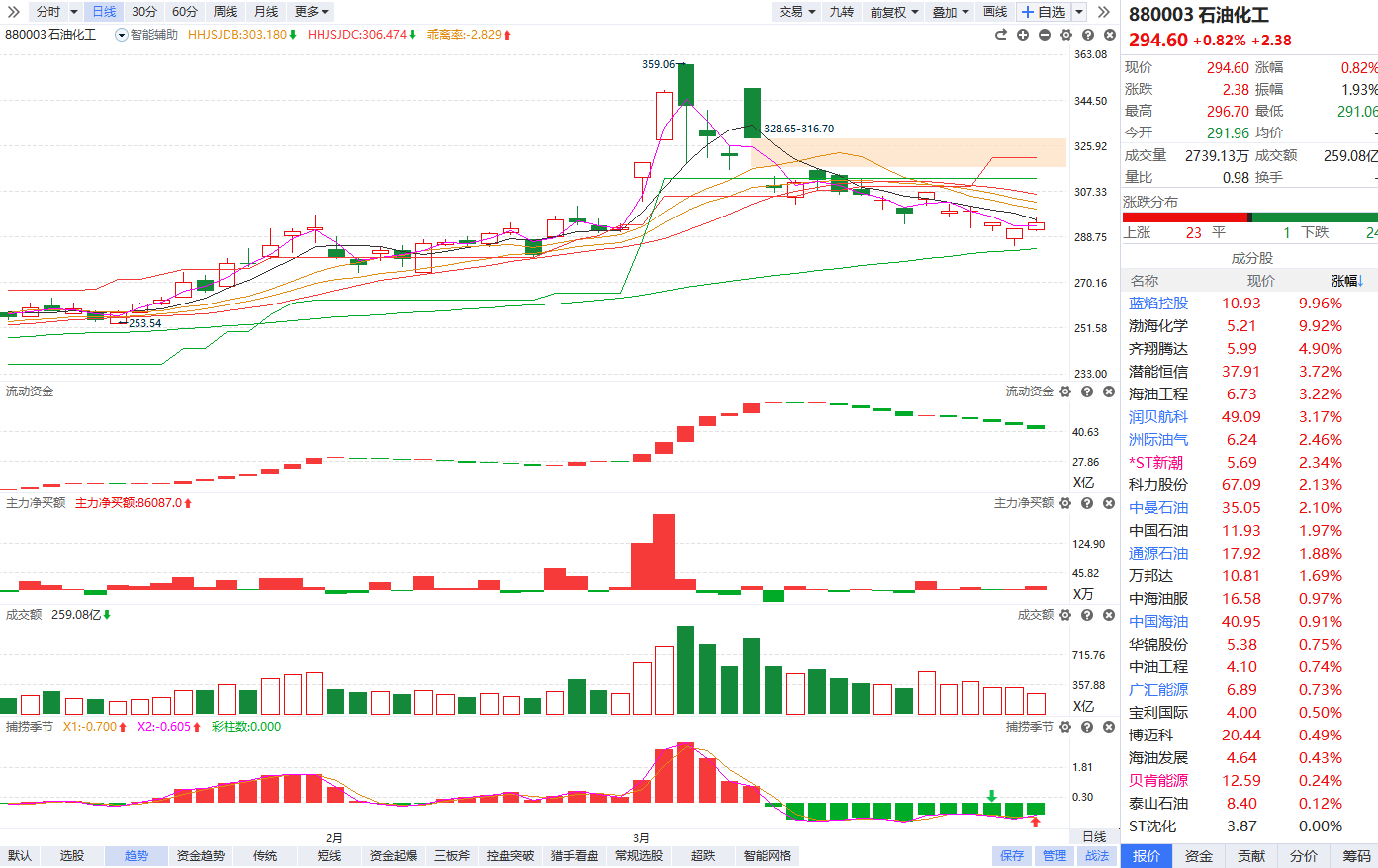 根据软件信号,板块近期流动资金持续翻绿,主力净买额红肥绿瘦,短线超跌后金叉反弹站上辅助线,如果流动资金能快速翻红,出现增量资金进场承接,有望形成震荡反弹趋势,可以关注站上辅助线后的首次死叉回档博弈。