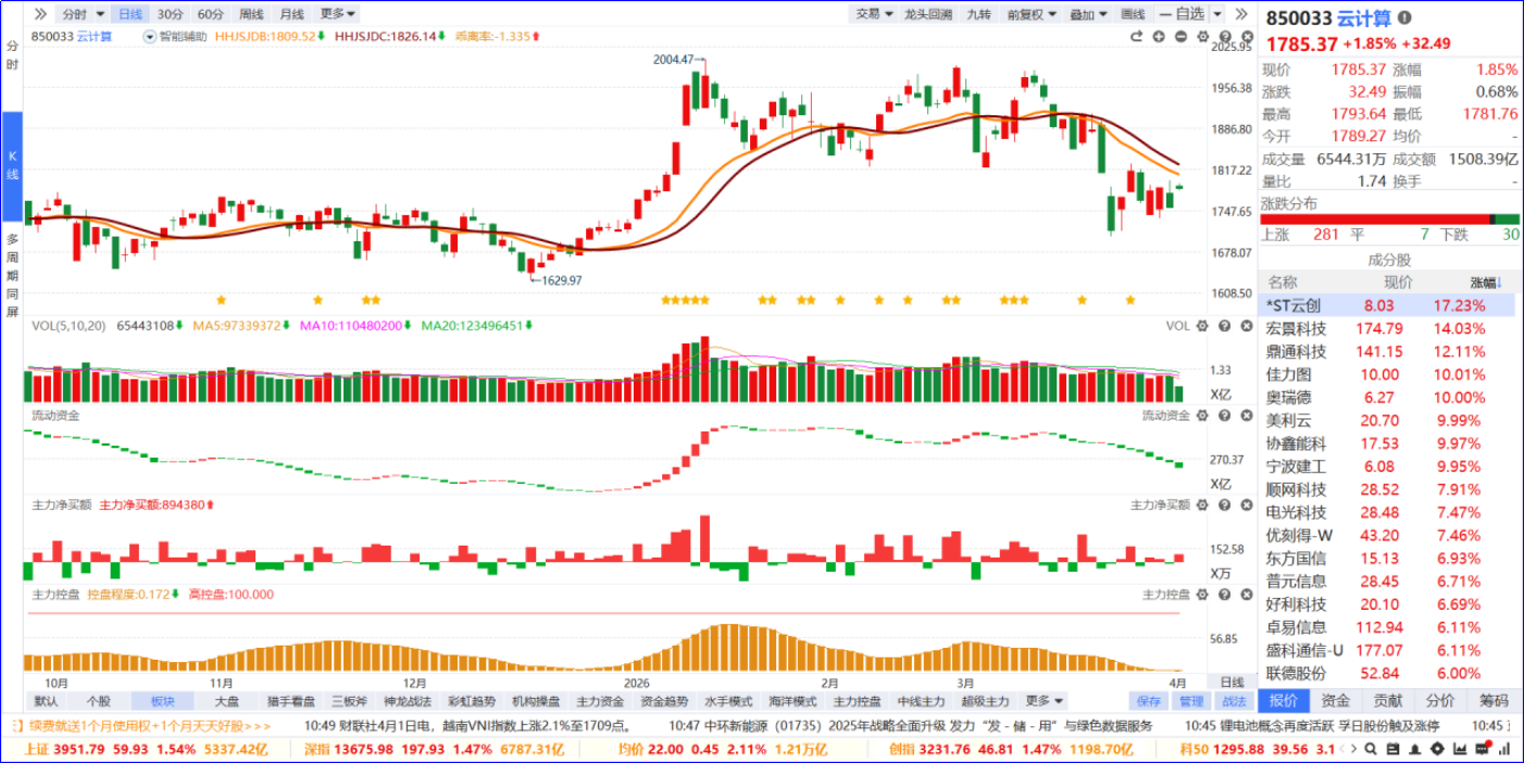 从软件信号看,云计算板块流动资金持续翻绿、主力净买额红肥绿瘦。从炒作逻辑看,智谱API提价83%、调用量暴增400%,验证AI大模型商业化拐点,带动云计算、AI算力全产业链需求爆发,形成“AI 应用→算力需求→云基建”的正向循环。从K线走势看,板块高位回调后逐步修复,今日温和上涨;板块内部个股普涨,涨停家数居市场前列。后续可聚焦AI算力、云服务核心标的,等待回踩支撑后的低吸机会。