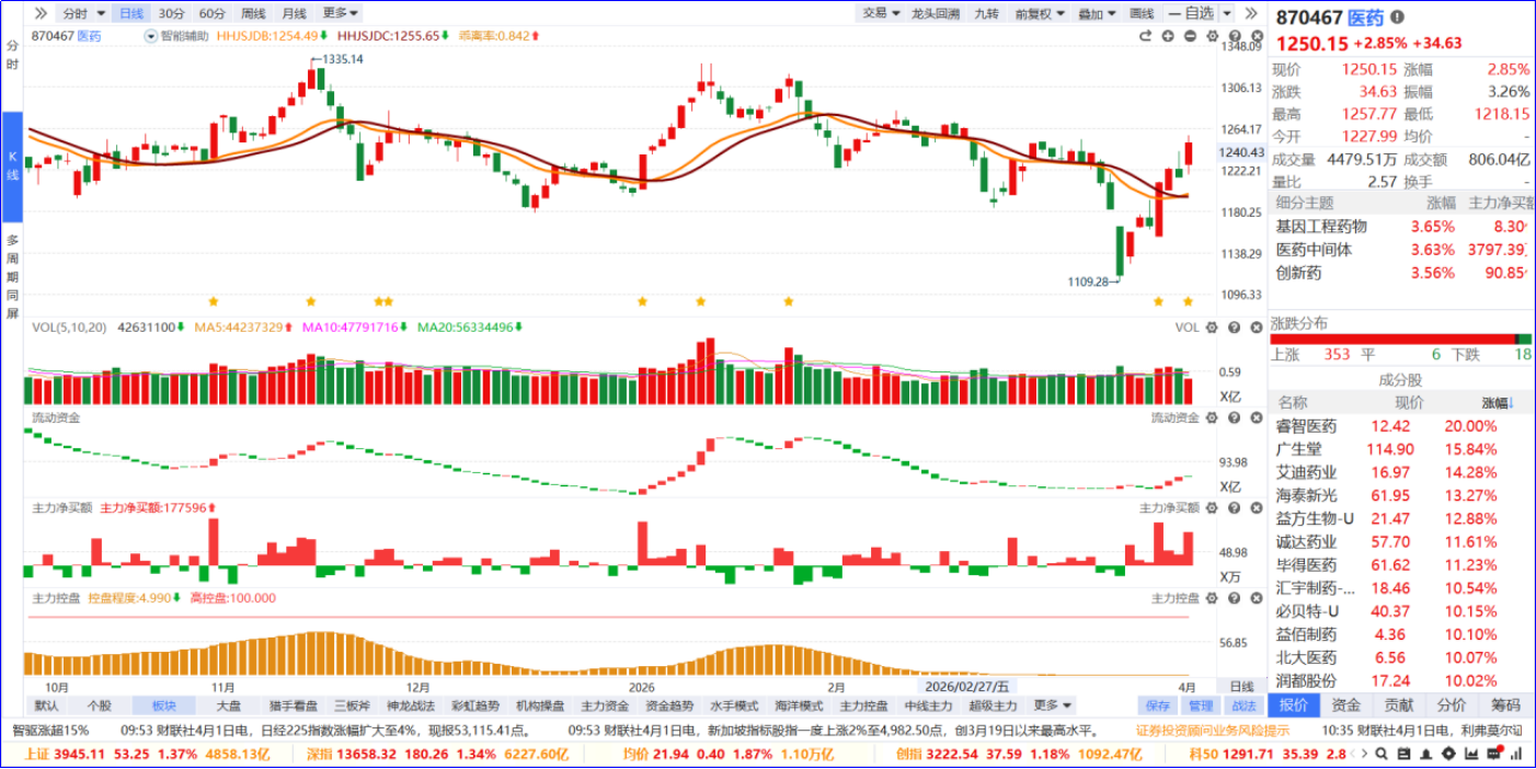 从软件信号看,医药板块近期流动资金持续翻红,主力净买额红肥绿瘦。从炒作逻辑看,一方面AACR年会即将召开,中国药企集中展示前沿研发成果,国际认可度与出海预期持续增强;另一方面Q1创新药对外授权超600亿美元,业绩与盈利预期大幅提升。从 K线走势看,板块低位企稳回升,逐步站稳智能辅助线,创新药标的领涨;板块内部个股普涨,涨停家数居市场第一位。后续可重点跟踪5日主力靠前主力资金、具备AACR催化与出海逻辑的核心标的。