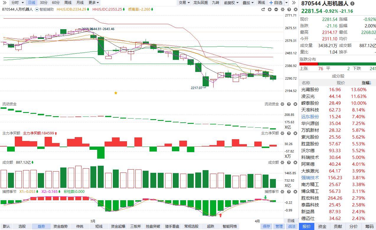 根据软件信号,板块近期流动资金持续翻绿,主力净买额红肥绿瘦,目前已经跌破辅助线进入弱势震荡区间,资金和趋势弱势,短线反弹更多是消息刺激的局部反抽,不具备太强的持续性,注意回避冲高追涨,耐心等待资金和趋势拐点。