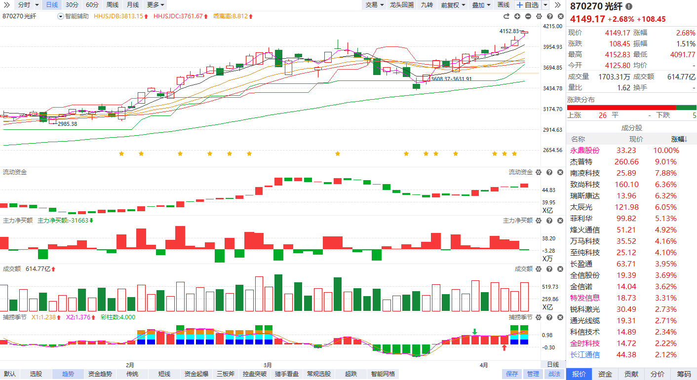 消息面上,截至2026年4月6日,由AI数据中心建设与地缘需求驱动的全球光纤市场涨价潮进一步确认,最新数据显示中国市场G652.D光纤价格自去年低点涨超400%,机构预计2026-2027年全球供需缺口将扩大至15%。
