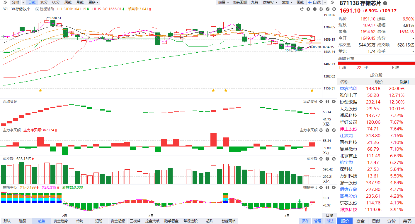 消息面上,中信证券研报表示,Agent AI时代存力为核心,驱动存储行业迎长周期范式转移。此外,香农芯创4月7日发布业绩快报,2025年实现营业总收入352.51亿元,同比增长45.24%;归母净利润5.44亿元,同比增长106.06%