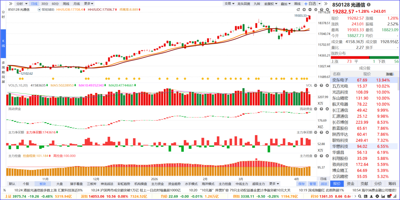 从软件信号看,光通信板块近期流动资金红绿相间,主力净买额红肥绿瘦,主力控盘度呈现高控盘。从炒作逻辑看,核心是Anthropic等海外AI巨头算力采购爆发,3.5吉瓦TPU算力落地验证全球AI算力需求高增,带动光模块、光交换等算力基础设施需求放量,叠加CPO技术迭代,产业链景气持续上行。从K线走势看,板块高位震荡昨日站上智能辅助线今日创阶段新高;板块内个股涨跌各半,涨停家数居市场第一位。后续可聚焦板块内部主力控盘度逐渐递增且处于较高状态的个股,只要未出现放量大阴线,就可继续跟踪关注。