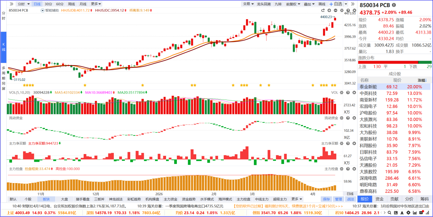 从软件信号看,PCB板块流动资金持续翻红,主力净买额红肥绿瘦。从炒作逻辑看,核心是AI服务器升级推动PCB向高多层、高阶HDI演进,ASIC算力迭代进一步提升PCB单台价值量,叠加AI算力需求爆发,高端PCB迎来量价齐升。从K线走势看,板块高位加速创阶段新高,今日放量大涨,板块内个股普涨,涨停家数居市场前列。后续可聚焦AI服务器高端PCB核心标的,把握技术升级带来的业绩弹性机会。