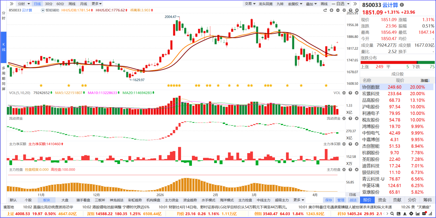 从软件信号看,云计算板块近期流动资金持续翻红,主力净买额红肥绿瘦。从炒作逻辑看,核心是英伟达GPU云端租赁价格暴涨,验证AI算力供需缺口扩大,叠加协创数据等算力租赁龙头一季度业绩暴增,验证赛道高景气,云计算全产业链迎来业绩与需求双驱动。从K线走势看,板块高位强势修复,今日温和上涨,涨停家数居市场第一位。后续可以聚焦板块内部5日主力排序靠前,优选流动资金持续翻红的个股跟踪,把握GPU涨价带来的业绩弹性机会。