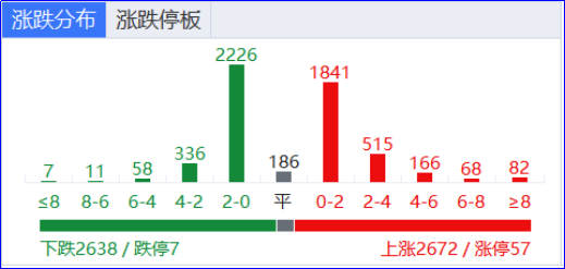 创业板指涨超2%,续创阶段新高,深成指均涨超1%。黄白线明显分化,权重股走势较强。沪深两市半日成交额1.5万亿,较上个交易日放量948亿。盘面上热点快速轮动,全市场近2700只个股上涨。截至收盘,沪指涨0.55%,深成指涨1.36%,创业板指涨2.13%。