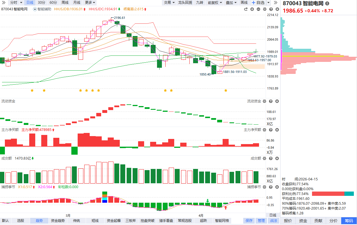 根据软件信号,板块近期流动资金持续翻红,主力净买额红肥绿瘦,回档金叉站上辅助线后,短期在平台压力附近震荡消化套牢筹码,后续首次回档如能走出资金翻红+熊线上移的反弹,有望形成上行趋势。
