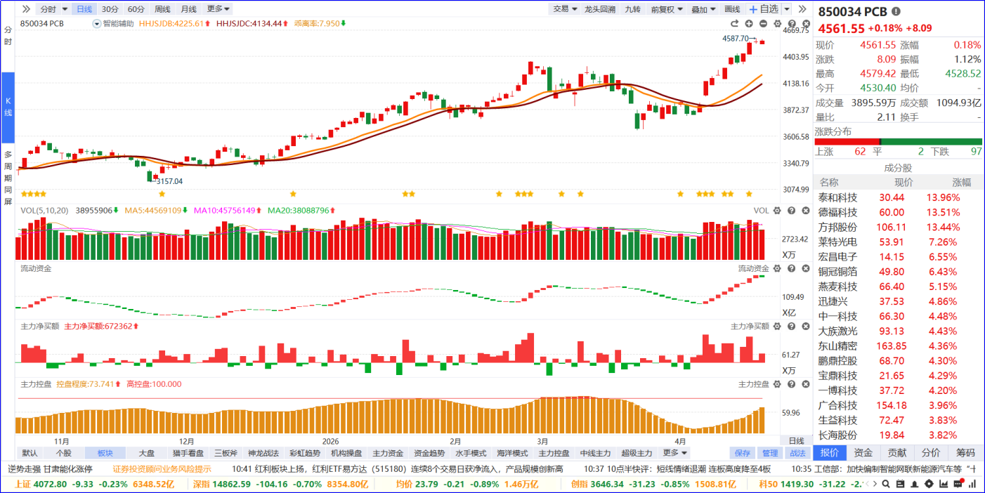 消息面上,东吴证券指出,头部PCB企业在AI领域的投入逐渐步入斜率向上的阶段,判断头部PCB企业存在2026年单季度资本开支持续超预期的可能,将对PCB设备企业带来良好的业绩拉动。