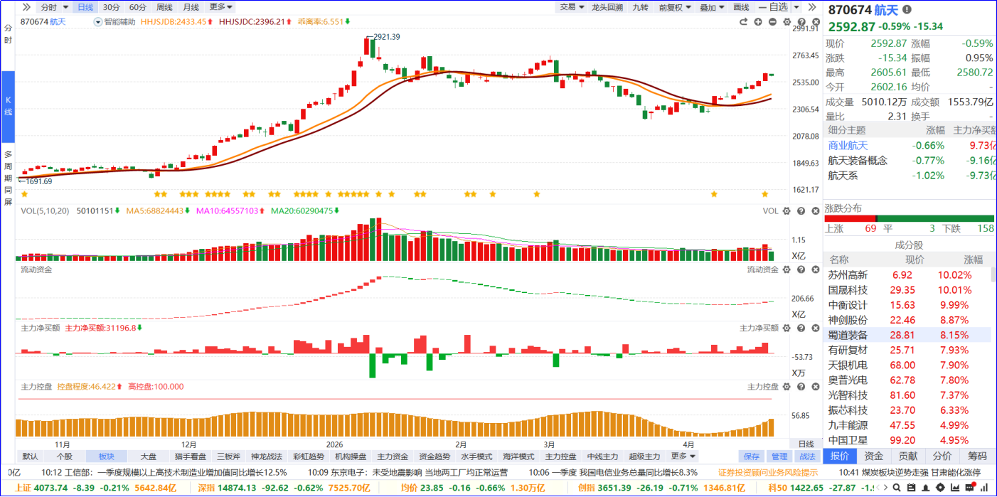 从软件信号看,航天板块近期流动资金持续翻红,主力净买额红肥绿瘦。从炒作逻辑看,核心是轨道辰光完成577亿元授信+股权融资,国内商业航天头部公司获大额资本支持,验证行业商业化价值与发展信心,带动产业链景气度提升。叠加中国航天日政策催化,商业航天进入政策+资本双轮驱动阶段。从K线走势看,板块高位震荡休整,趋势保持向好;内部个股分化严重,涨停家数居市场第一位。后续可聚焦板块内部5日主力排序靠前,优选流动资金持续翻红的个股跟踪。