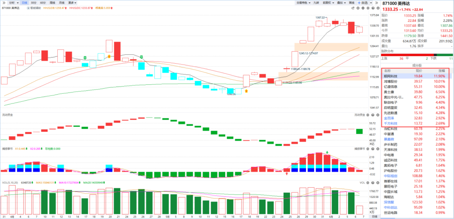 根据软件信号,板块在连续上涨后,近期接连出现中大阴线调整,捕捞季节出现日线顶背离的风险信号,趋势已经走弱。尽管超跌后今日有反包表现,但反弹至低开缺口时仍要面临分化压力,注意尽量回避高位追涨操作。
