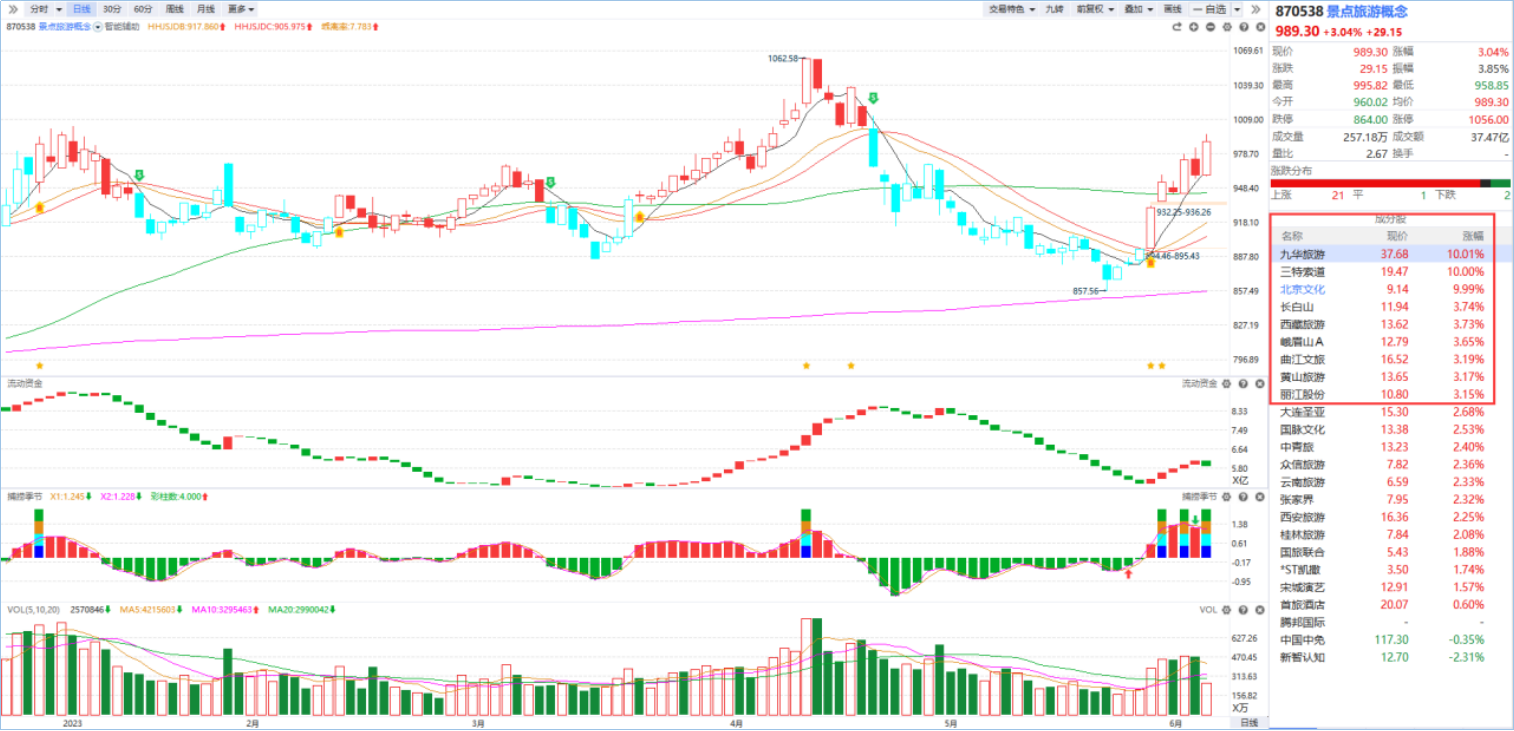 在早盘的晨会栏目中也有提及,“寺庙经济”相关的旅游板块有望迎来低吸布局机会。根据软件信号,板块自4月中旬以来持续下跌,已经进入超跌状态,近期放量突破智能辅助线出现B点信号,首次回档具备博弈价值,持续关注板块内资金活跃个股的四线开花机会。