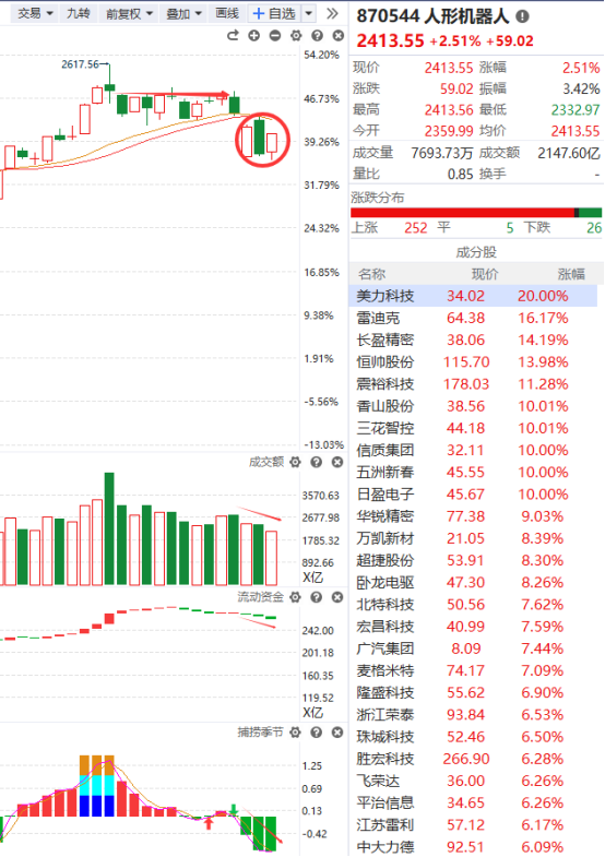 人形机器人板块的突发爆发着实出乎意料,不过近期机器人的走势整体表现一般,在市场弱的时候它能突然拉一波,出来带带节奏,但又没有持续性,又会在我们已经丝毫不关注它的时候给我们一些惊喜,目前它仍面临辅助线的压制,各项指标也没有好转的迹象,继续保持原有的状态,等什么时候突破辅助线的压制或趋势好转之后再关注。现在的板块跟指数一样“神一天鬼一天”,别看今天涨得挺好,明天很有可能说翻脸就翻脸。