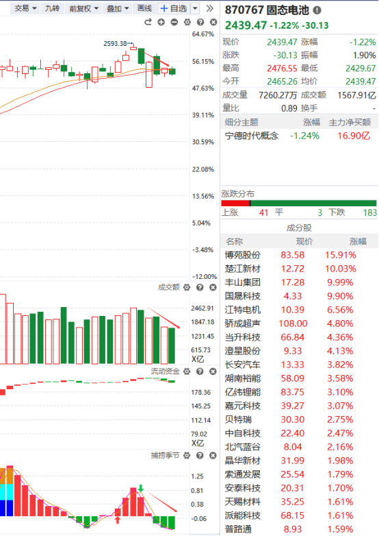 固体电池概念整体走势一般,这在一定程度上受到市场情绪偏弱的影响,目前它正处于能否在智能辅助线上方企稳的关键阶段,不过从目前各种指标的状态来看,它很难企稳,除非市场能及时止跌企稳,它才有可能展开反弹行情,先保持观望吧!