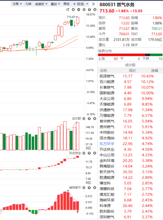 冷空气的降临不仅影响了各地的气温也影响着各种具备供热的板块,像煤炭、天然气、燃气水务等都迎来了不错的上涨行情,目前它们的走势都还不错,短期也能借助这波冷空气的来临迎来一段持续的上涨行情,可持续关注。