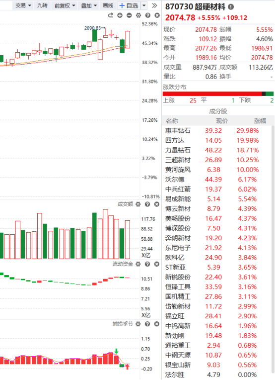超硬材料近期的趋势不错,目前正处于回踩智能辅助线的关键阶段,今天的反弹行情让成交量突然放量,但流动资金呈翻绿状态,捕捞季节刚收出金叉,整体来说好坏参半,鉴于它有政策的刺激,短期可以持续关注一下。