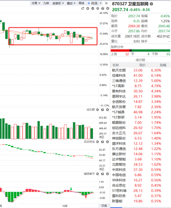 卫星互联网的走势说强不强,说弱不弱,整体围绕着智能辅助线上下波动,在大环境不好的背景下,它还能保持横盘震荡而不大幅下跌,这从另一个角度来看,说明它的韧性足够强,只是目前它并没有走出很强的上涨趋势,继续保持观望吧。