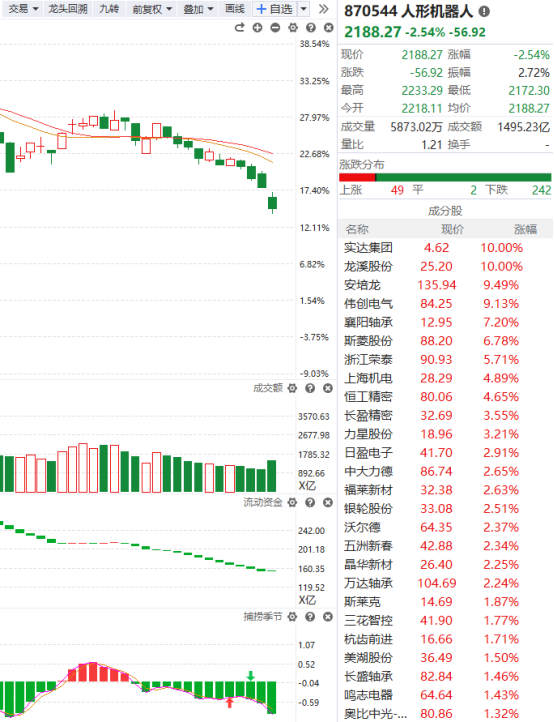 人形机器人在午盘有异动拉升的动作,在市场这种悲观情绪的大背景下,那个板块率先按不住,那么下次反弹的时候它有可能最先启动,所以对于这些跌幅较大的热点板块应该逐渐关注起来,它们随时都有可能爆发出反弹行情。