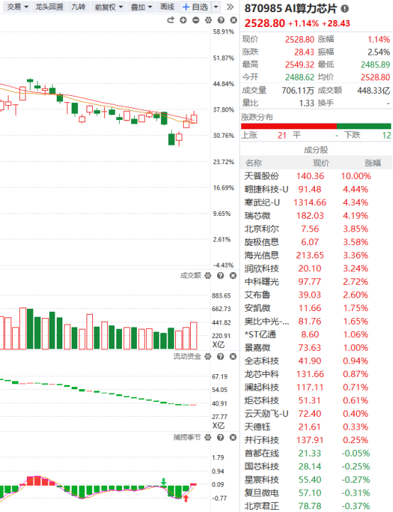 算力芯片的突破力度比较强,昨天从底部直接跳空高开,今天就突破辅助线的压制,该板块的趋势没有问题,未来的成长空间也比较大,而且所处的位置也比较低,只要不跌破辅助线的支撑都是不错的买入时机。