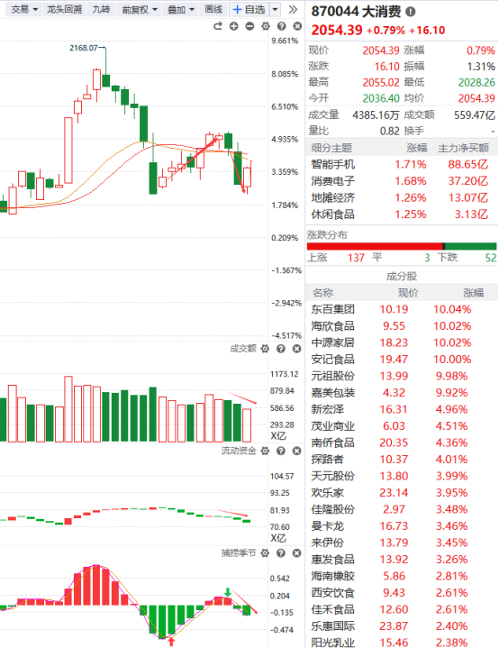 大消费受到市场情绪回暖的影响今天止跌企稳并展开了反弹行情,趋势稍微有所好转,但并不明显,鉴于该方向一直是国家重点提及的方向,未来的上涨空间肯定是比较大的,对该方向感兴趣的可以低吸入场耐心等待后续的反弹行情。