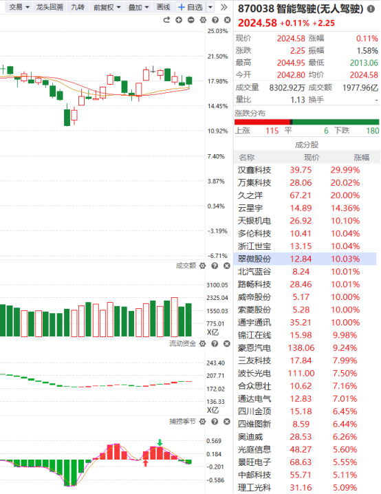 智能驾驶今天的反弹很大程度得益于政策的刺激,由于最近市场呈现震荡走势,很多平时没怎么表现的板块容易在政策刺激下反弹,而这类板块有一个很明显的特征,就是来得快去的也快,但该类板块也有一个很大的优势就是所处的位置也比较低,只要它的趋势没有彻底走坏就可以在调整时积极介入。