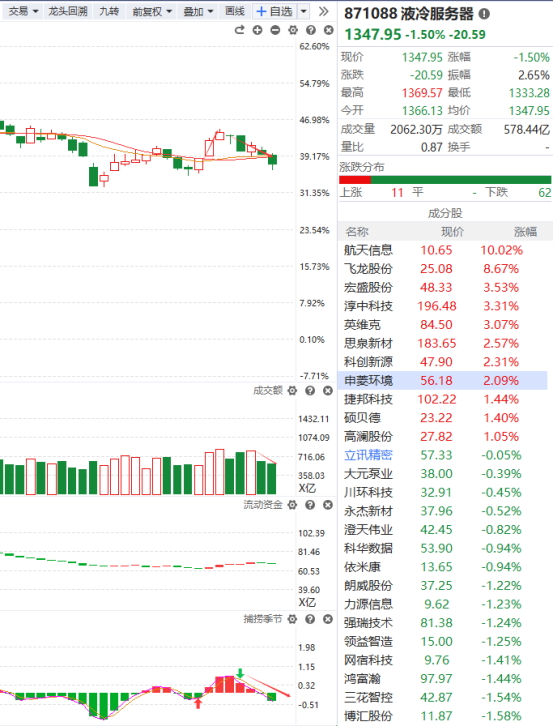 液冷服务器虽然有局部个股异动拉升,但板块并没有因此走出很强的反弹行情,而且异动的个股只有少部分,很难撬动整个板块,而且它离跌破辅助线的支撑仅剩一步之遥,先看它能否在辅助线止跌企稳,能则关注不能则不做过多的关注。