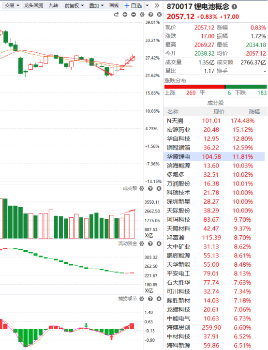 锂电池今天的走势还行尤其是早盘的那一波大幅拉升,如果不是午盘市场来了一波跳水行情,它今天的走势绝对是很强的,目前它的趋势保持得不错,流动资金翻红,捕捞季节收出金叉,成交量也呈逐步放量状态,只要不跌破辅助线的支撑逢调整就是不错的买入时机,但如果趋势走坏了就没有必要去买入了。