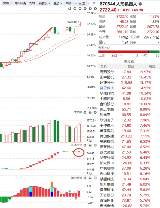 人形机器人的趋势非常不错,属于回档金叉初期,成交量呈逐步放量状态,流动资金翻红,捕捞季节收出金叉,该方向未来的成长空间很大,持有该方向个股的继续拿着就行了。